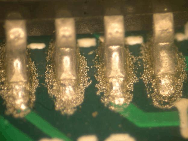 錫球大多數(shù)發(fā)生在PCB零件面,由于PCB過(guò)錫時(shí)未干的助焊劑揮發(fā),或者空氣中水汽太多,當(dāng)這些水分接觸到高溫的熔錫時(shí),氣體大量膨脹,造成錫的爆發(fā),錫就被噴涌而出形成錫球。